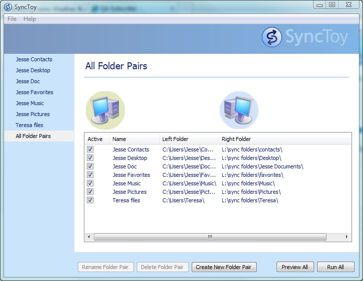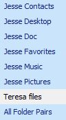 - Click the folder pair you want to sync (in this example, we want to run the folder pair called Teresa files. This list is on the left hand side of synctoy window)