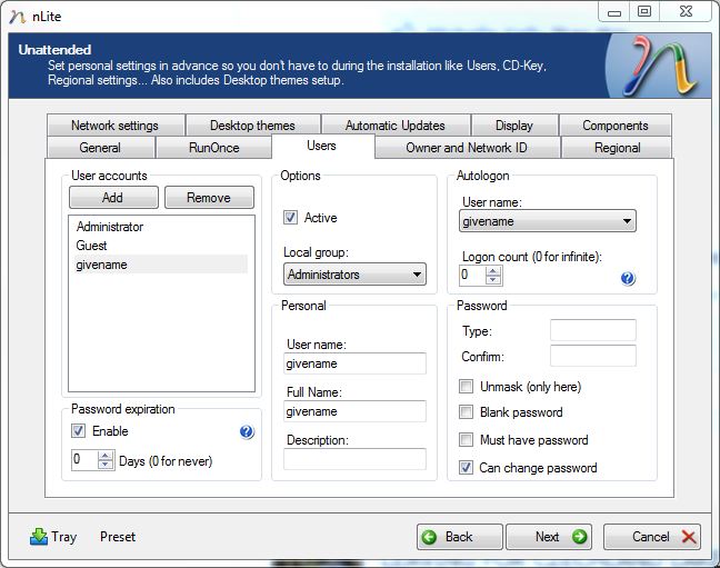Note: if you want the system to automatically log you on when it boots up, only create one user. If you create more than one user, you will have to make changes later in order to make it log in automatically. If you need to do that, download powertools.