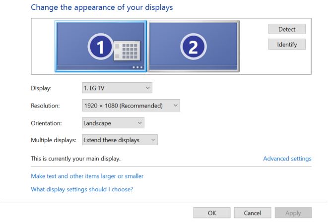 Show Desktop only on 1 - will only have video on Monitor 1. Monitor 2 will be blank (to find out which monitor is number 1 and which one is number 2, click identify)